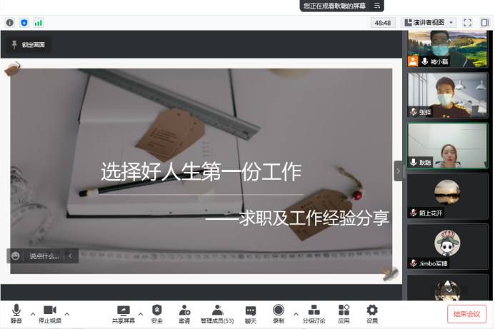 2021届优秀校友冷柚兵和耿聪以及2019级硕士研究生沈梦蓉从定向选调(参与西部计划)、专业对口与跨专业就业三个方面与全体研究生进行分享。本次活动由学院兼职就业辅导员褚小磊主持。