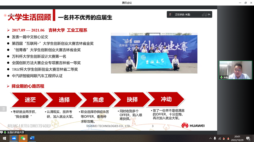 活动伊始,段彩云女士聚焦于华为销售岗位,向同学们系统介绍了华为公司的整体情况、销售岗位的相关工作和职业发展情况。随后,黄钰和朱磊向学生分享了华为面试技巧及入职华为1年的工作经历。作为吉大机械学院毕业的校友,他们向同学们分享了跨专业就业的心得感悟,鼓励师弟师妹要善于发掘自身优势与潜力,尽早做好适合自己的职业生涯规划。