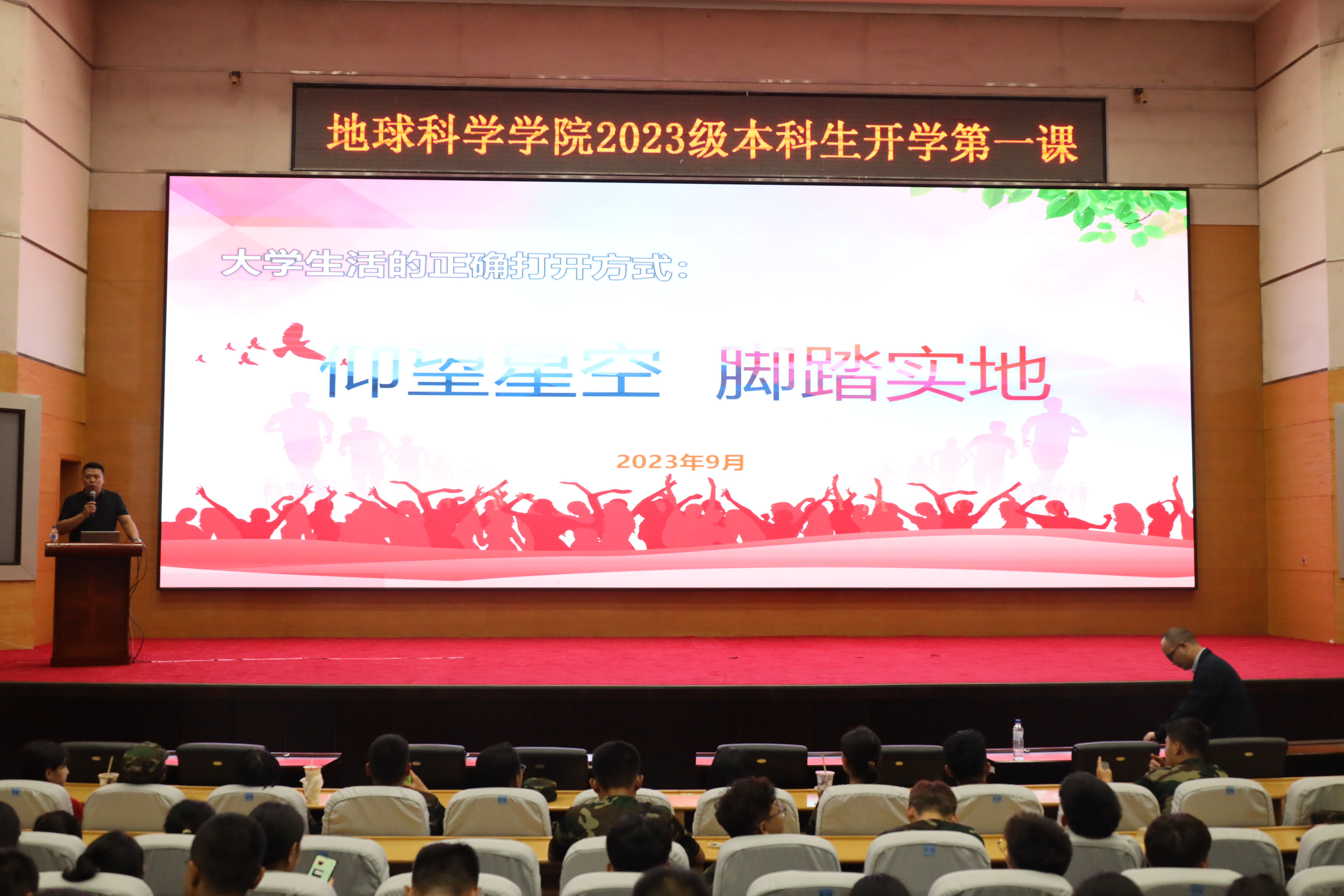 在大学学习和生活部分,李阳副书记强调大学的正确打开方式为“仰望星空,脚踏实地”。他结合自身经历,呼吁同学们尽快适应大学生活,找到适合自己的学习和科研方法,正确把握学习与娱乐的关系,将有限的时间更多地投入到知识的学习中去,以往届优秀学子为榜样,传承地学精神,把握“战点”,成就自我。李阳副书记也告诫全体新生,要积极参加校园活动,丰富大学生活,杜绝“线性思维”,坦然面对挫折,提升综合素质。