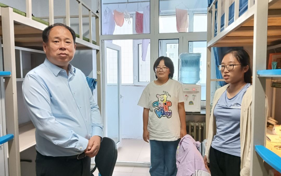 在北苑一公寓6096寝室,得知新生来自山东、甘肃、新疆、重庆等不同省份时,杨洲书记询问了大家的来校交通方式、父母是否陪同、是否适应东北的气候和饮食等。同学们纷纷谈了自身感受,杨洲书记分享了自己的大学生活经验,鼓励大家尽快适应东北生活,充分锻炼自己,提高自主生活意识,加强沟通,建立良好的人际关系,努力营造和谐稳定的寝室氛围。在6137寝室,当听到新生家庭遭遇洪涝灾害导致农作物被淹时,杨洲书记详细询问了学生家庭的受灾情况,了解了学生当前学习生活状况。李阳副书记介绍了学院对受灾学生采取的关怀相关举措。杨洲书记鼓励学生以积极的心态正视家庭遇到的困难,学会在逆境中成长,努力学习、自立自强,以坚定的信念、踏实的行动、丰富的知识改变命运。