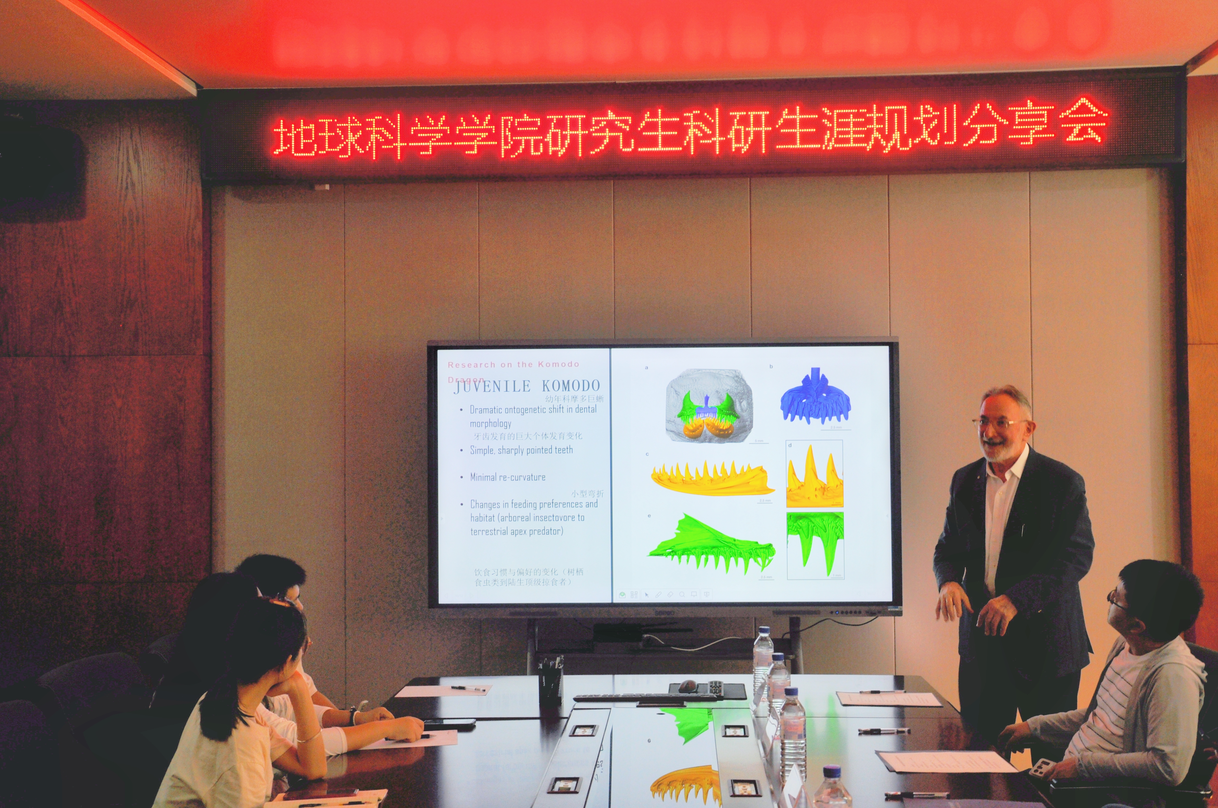 外聘杰出教授、恐龙演化研究中心名誉主任罗伯特·赖兹教授在鸽子楼109-2会议室开展研究生科研生涯规划分享会。活动由党委副书记马旭主持,学院副院长柳蓉、恐龙演化研究中心副主任陈军、古生物与地层学教研室主任李晓波参加此次活动。