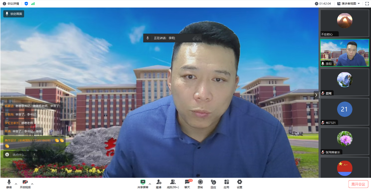 随后,李阳副书记与全体家长进行了互动,就家长提出的转专业、考试、专业分流、入伍参军政策、选调生考试、就业前景等问题进行了一一解答,李书记仔细认真的回答获得了家长们满意称赞,新生家长会在温馨友好的氛围中圆满收官。