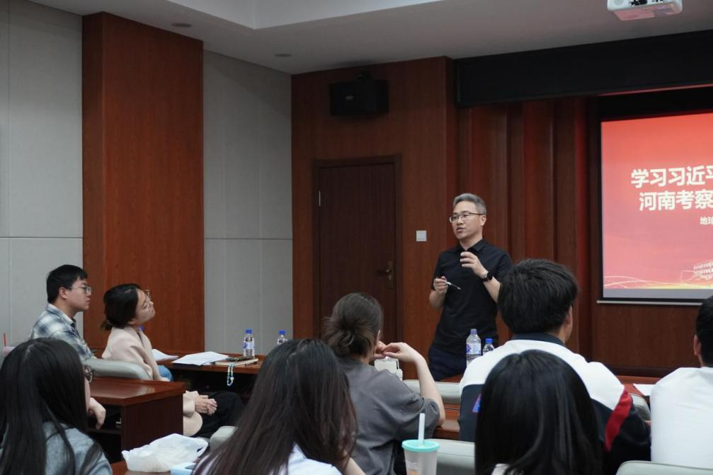 最后,全体党员在李阳老师的带领下认真学习了习近平总书记在河南考察时发表的重要讲话精神。李阳书记指出,我们要以科技创新为引领,勇担地质人的时代使命;以文化自信为根基,传承弘扬科学家精神;以实干笃行为准则,争做新时代“答卷人”,将党中央的最新部署和要求融入日常学习与行动自觉,与祖国同频共振、与时代同向同行,在求学的时光里勇往直前,在服务国家战略中实现人生价值。同时李阳老师还征求了学生党员对学院、学校事业发展的建议,了解掌握师生急难愁盼问题。