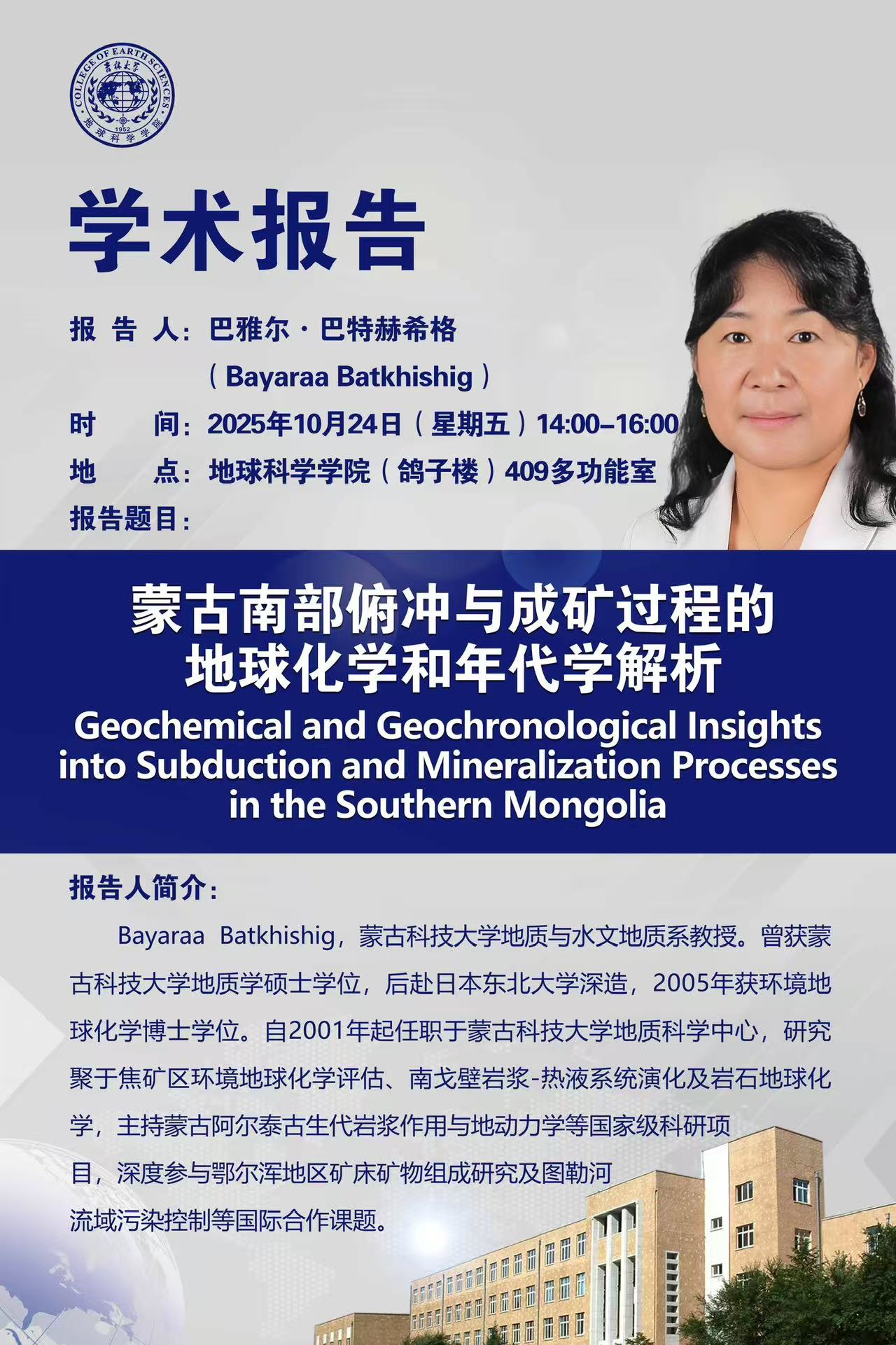 蒙古科技大学地学研究中心主任Baatar Munkhtsengel教授学术报告