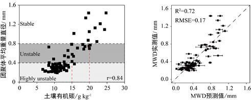 图1(a)土壤有机碳与团聚体稳定性相关关系图和(b)基于可见-近红外光谱的团聚体稳定性预测模型精度评估