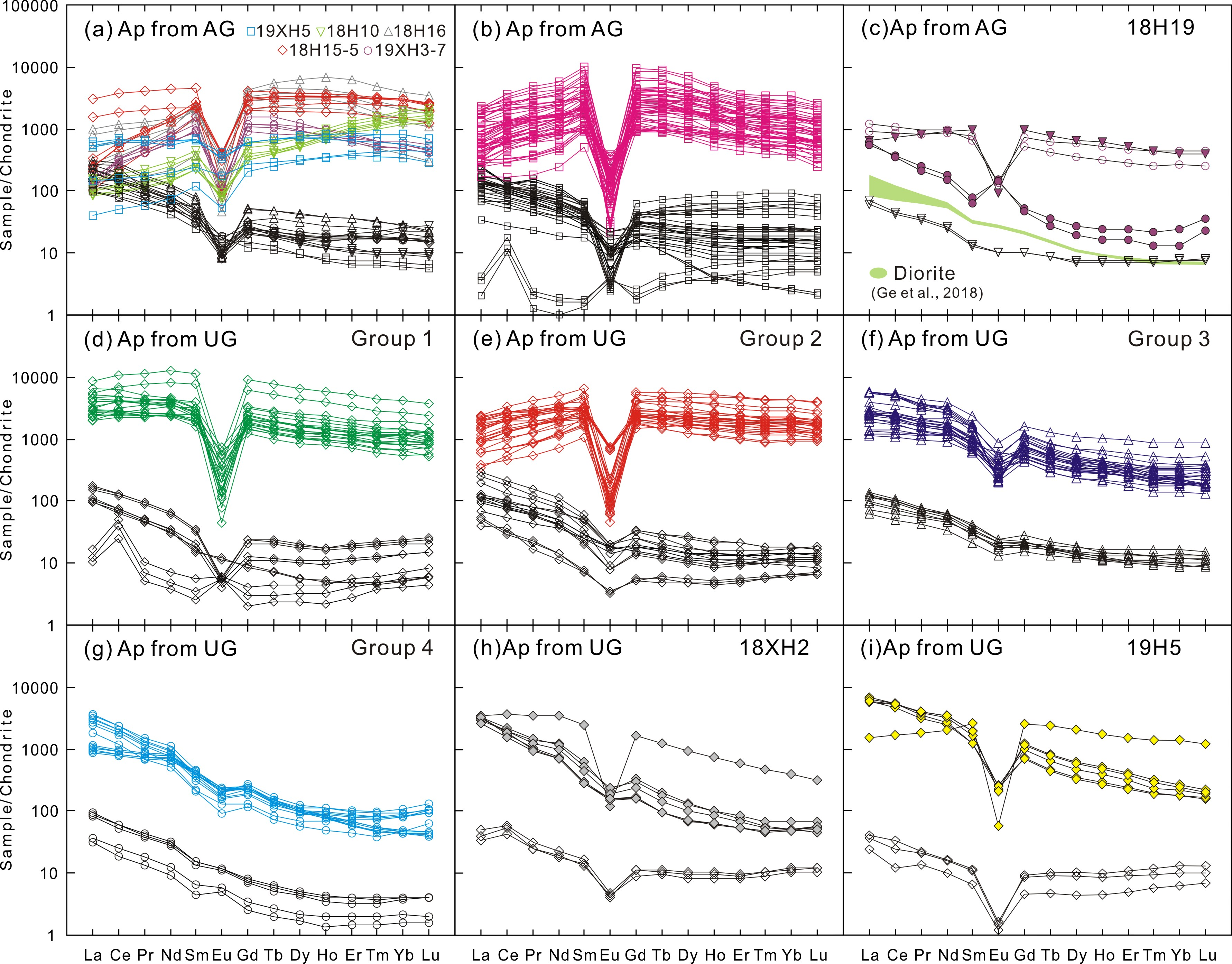 (3)根据本文岩浆成因磷灰石的REE含量和配分模式,进一步将其划分为四组。第一组磷灰石具有与全岩类似的右倾型REE配分模式,但相对更富集MREE(图3d)。由于相比于LREE和HREE,磷灰石具有更高的MREE分配系数,该组磷灰石反映出母岩浆组成和REE分配系数对磷灰石地球化学组成的控制作用。第二组磷灰石明显亏损LREE(图3e),而第三组磷灰石则具有低的MREE和HREE含量(图3f),分别指示了绿帘石族矿物和角闪石结晶对磷灰石的影响。第四组磷灰石具有非常低的HREE含量和高的Sr含量(图3g),继承了其寄主岩石—埃达克岩的重要特征,并在利用磷灰石的地球化学组成判别埃达克岩的图解中落入了埃达克岩的区域内(图6中粉红色圆圈)。