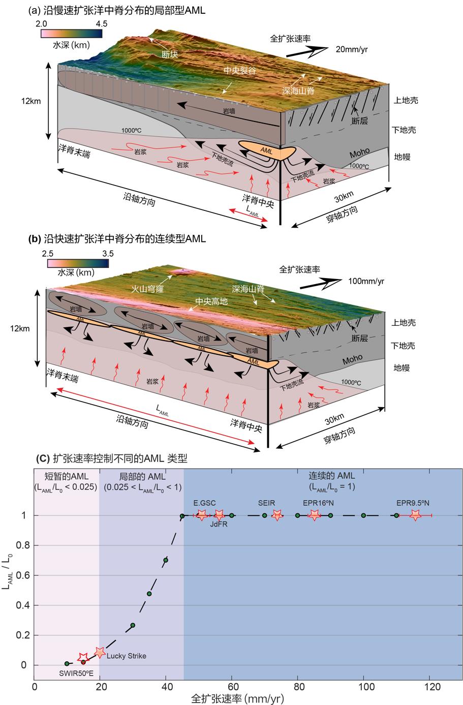 图3. (a)-(b) 展示了不同扩张速率洋中脊的AMLs 分布方式及与之相关的地壳增生方式。(c) 扩张速率控制AMLs沿轴发育的长度与整个洋脊段的比值(LAML / L0),绿色点为模型计算获得,五角星代表自然界观测数据。