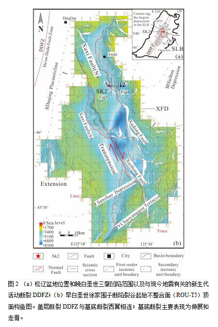 松辽盆地面积26万km2,地处我国东北。它不仅是东北亚地区规模最大、油气最富集的盆地,同时也是全球白垩纪地层记录最齐全的巨型沉积盆地。它被誉为是新中国油气工业的摇篮,在世界石油地质研究中占据独特的重要地位。松辽盆地油气地质研究已经取得了举世瞩目的成就,成为过去60多年该盆地中浅层油气勘探开发的理论支撑。然而,由于埋深大、难以获取有力的直接地质记录,因此大大增加了埋深五千米以下的深层/超深层盆地属性的探索难度;这使得人们对松辽盆地初始裂陷的形成过程迄今还缺乏必要的认知(图1)。