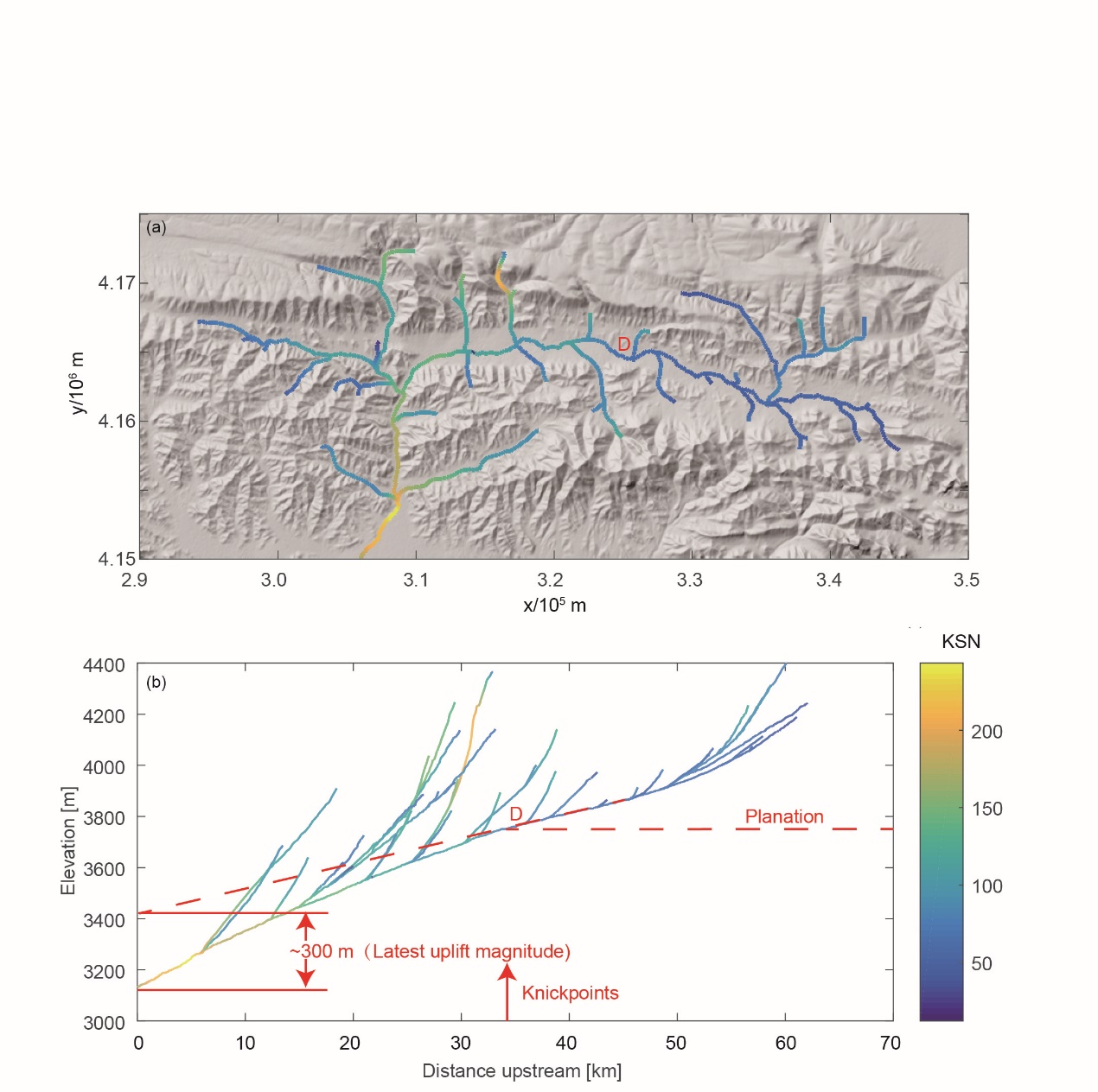 图3 巴勒更河河流纵剖面与河流平面形态