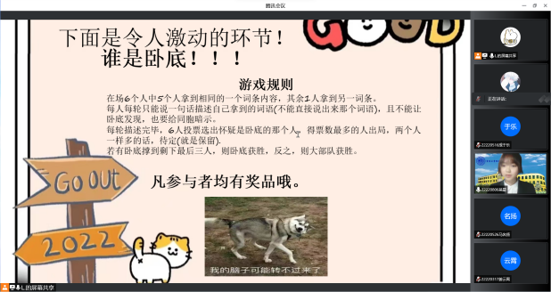 在介绍的环节中穿插的小游戏“谁是卧底”将气氛再次点燃,同学们积极报名,“西瓜”与“哈密瓜”的角逐激烈而迅速,参与的同学也都各有收获。