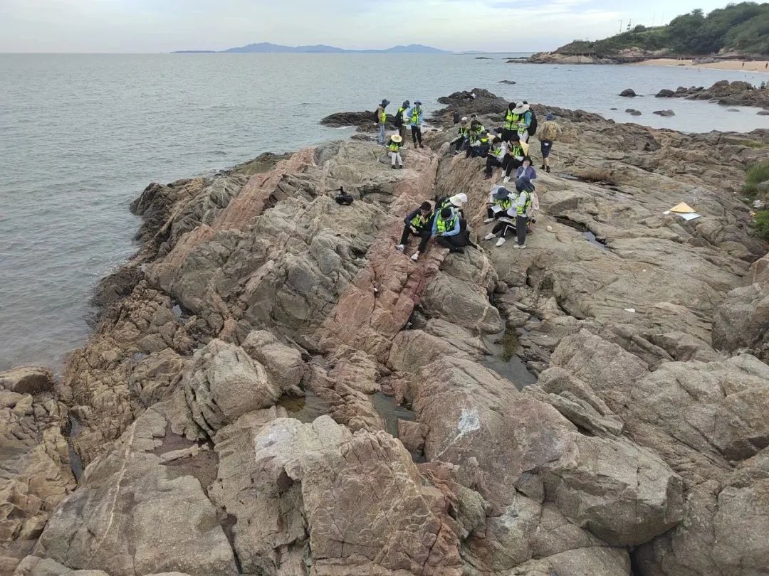 第一天就走了台里海滨路线,大海的广阔壮美深深震撼了同学们,不少来自内陆省份的同学都兴致高涨,阳光、沙滩、海岸带来了无限美好,史骁老师与同学们站在礁石上,探讨着岩体岩脉的岩性,引导同学们观察着身下的片麻岩、伟晶岩、糜棱岩、细晶岩与辉绿岩五种岩石的穿切与包裹残留,定下它们的新老顺序,在2.5GA的片麻岩与112MA的辉绿岩交叉穿切之中,无言而宏大的地质史书展现在同学们眼前。沿着沙滩行走,潮间带发育的贝壳堤在脚下咔嚓作响,走近海岸边浪花涌起的波切台地之后,可以看到礁石上的海蚀穴与海蚀槽,沙滩上间隔出露的糜棱岩中也发育了非常好的眼球状透镜体,在史骁老师的指导下,同学们学会了辨别糜棱岩形成时的应力方向。最后,同学们观察了野外煌斑岩体的特征,巩固并拓展了课堂上所学的火成岩与变质岩的相关知识。