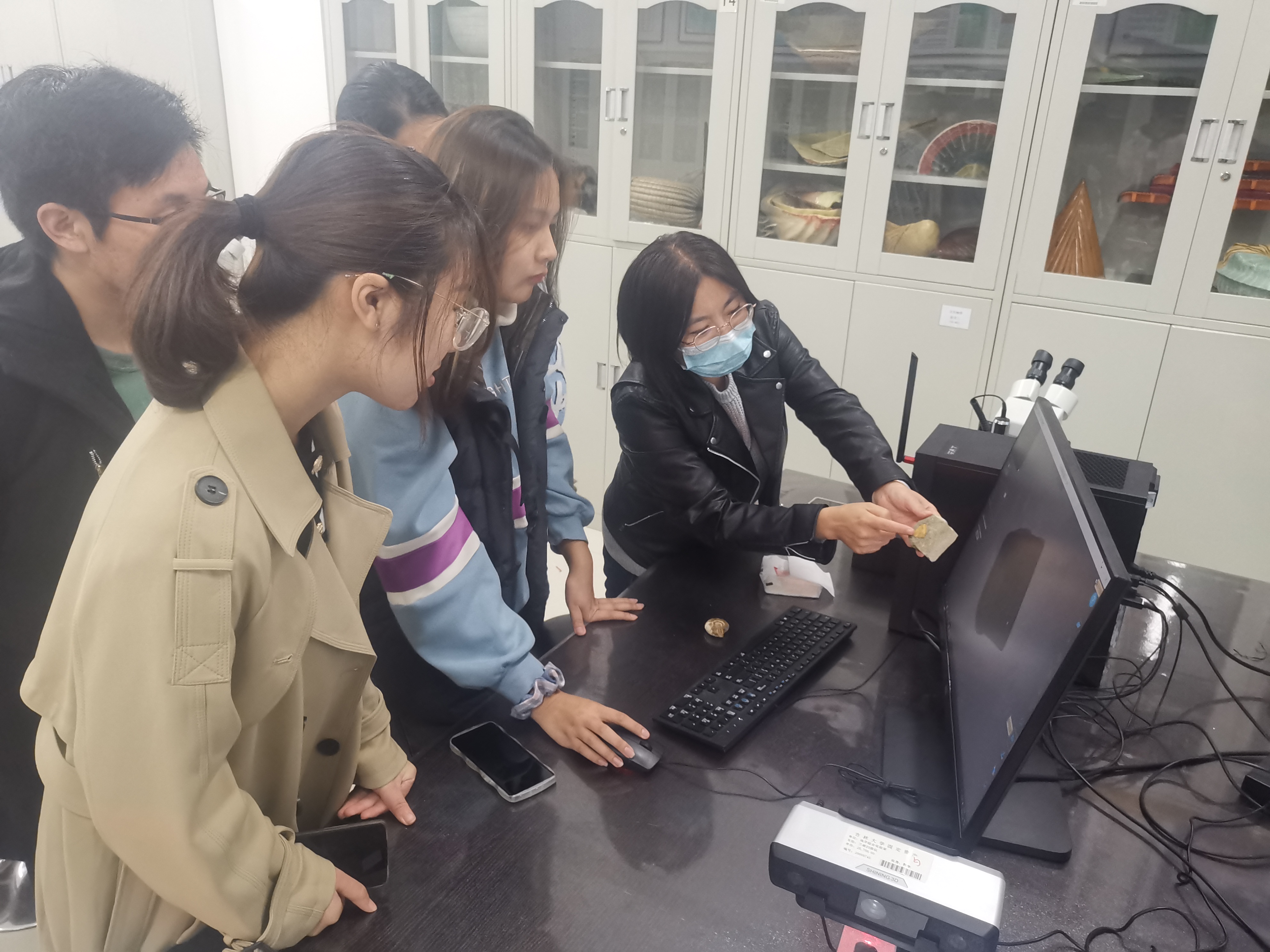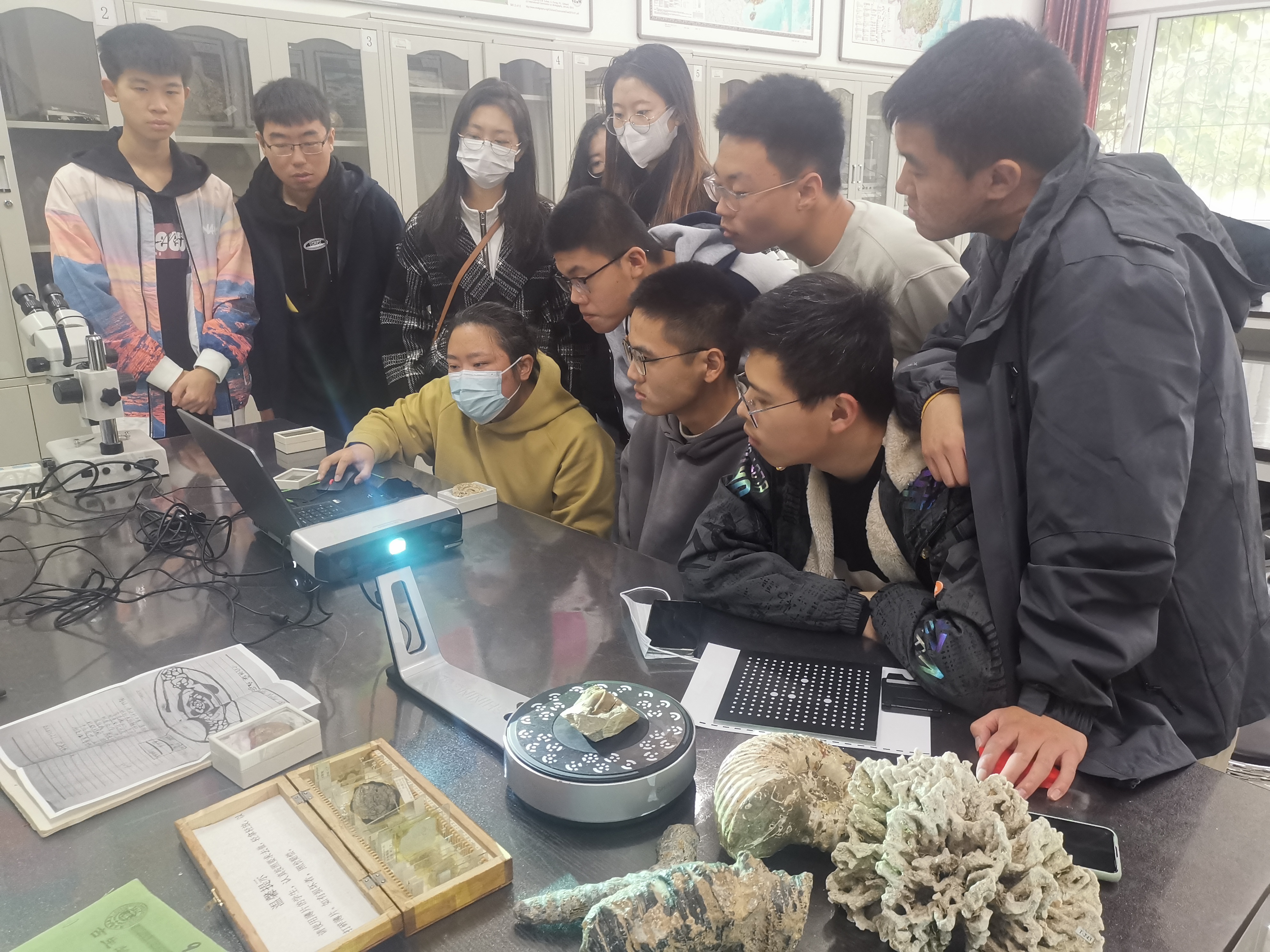 进入实验室的同学对古生物化石表现出强烈的兴趣,反复观察、拍照、发朋友圈,并对古生物、地质类及专业学习等感兴趣的问题进行咨询(图1)。活动伊始,杨韩涛老师介绍了地学基础实验教学中心的基本情况、古生物学实验室的实验教学活动及丰富多彩的课外实践活动,“地质+”双创基地的“化石3D数字化保护”、“无人机实景三维建模”、“化石文创开发”等创新创业活动,鼓励同学们积极参加专业实践活动,不断开拓自己的创意思维(图2)。杨老师对 “远古的呼唤——云南禄丰龙化石科考发掘”活动(央视总台2021年生物多样性大会COP15十一大型直播)进行点评,介绍了化石科考发掘以及化石如何进行3D扫描打印的数字化采集、修复及化石保护。实践活动部分,恐龙演化中心的王陇翰博士,利用手持扫描仪,对实验室内的1/10微缩恐龙模型进行扫描,重演了禄丰龙科考工作3D数字信息采集过程(图3-4)。之后,在实验室王欢老师、赵立敏老师指导下,同学们亲自动手操作桌面型扫描仪对三叶虫、菊石等化石进行了扫描(图5-8)。活动中,杨老师演示了三叶虫化石3D打印,展示了往届同学制作完成的化石模型。本次扫描的化石数据,活动结束后会陆续打印出来,并指导同学完成模型抛光、上色等后续处理工作。