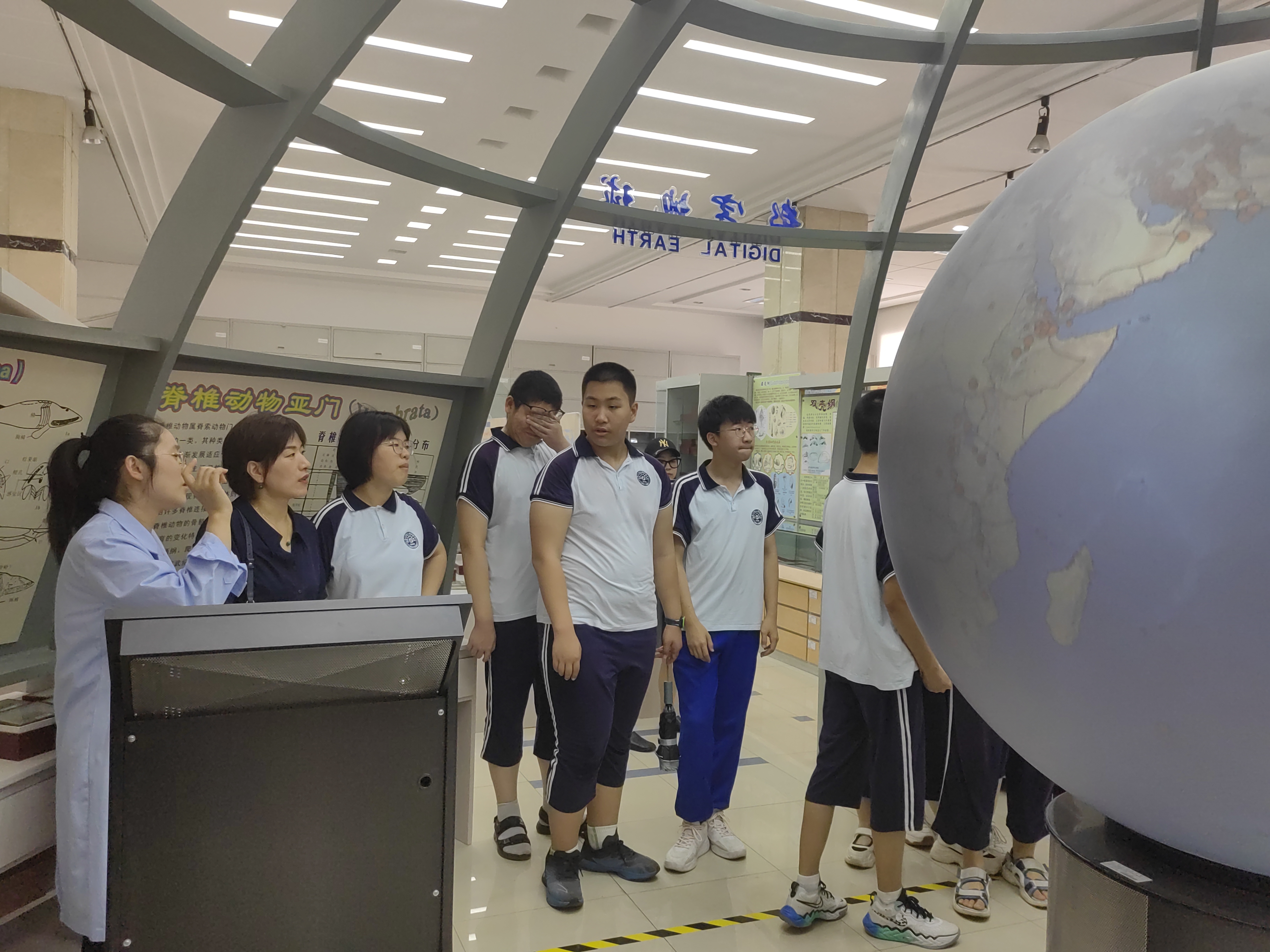 地球演化综合实验室,一块块化石串起了我国古生物多样性,球幕投影追溯了从海洋到陆地的古生物演变进程,化石清修及3D打印勾勒出古生物工作及化石数字化保护的轮廓,同学们对地质年代、地壳运动与生物演化有了感性认识。最后,实验室老师组织了“恐龙蛋盲盒”的互动小游戏,同学们通过恐龙蛋、火山弹、球形风化、灰岩结核等球状岩石构造标本的讲解与亲自动手观察对比,了解恐龙蛋的分类与简单鉴定方法、恐龙灭绝的原因,激发了同学们探索神奇大自然的热情。