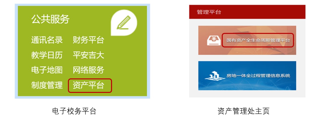国资平台可从电子校务平台、资产管理处主页访问或通过//zc.jlu.edu.cn/访问,该平台在校园网运行,外网可通过vpn进行访问。