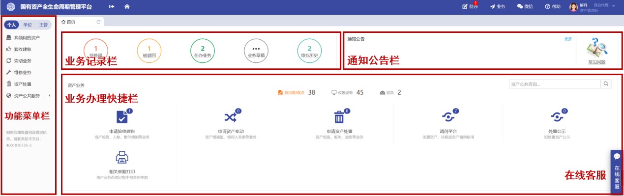 国资平台秉承用户办理业务“只进一扇门”的管理理念,系统主页 集成了5个模块:功能菜单栏、业务记录栏、绅士漫画公告 栏、业务办理快捷栏、在线客服等。